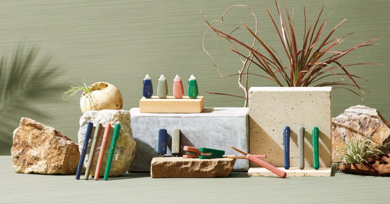 第11弾では、「Deep Nature」のカラーを取り入れた、マーカーと極細ペンが1本になった「2ウェイマーキングペン」、キャンパスノートの罫線の太さと紙色に合わせた「修正テープ」、刃をスライド式で出し入れできる「携帯ハサミ」、コンパクトに折りたためる「ポータブルステープラー」をラインアップしています。