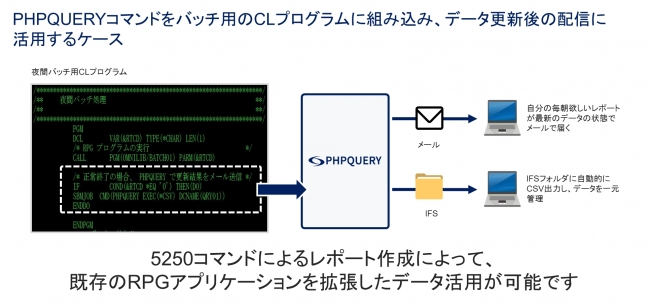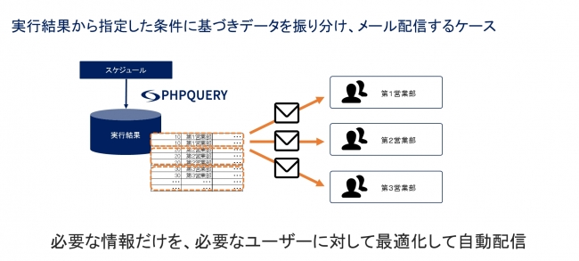 さらに、PHPQUERYが標準で提供する「スケジュール実行機能」と「メール配信機能」を活用することで、ユーザーが能動的に利用するWeb照会機能だけでなく、最適なユーザー属性に応じた自動振り分けメール配信設定や、5250コマンド実行による既存バッチプログラムからメール配信やフォルダ出力など、より効率的且つオートメーション化されたレポート配信が可能となります。