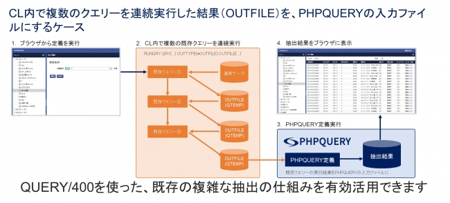 これまで「PHPQUERY」は、PHPQUERYの定義作成支援ツールが提供する機能の範囲の中でのみ、データ抽出条件を設定することが可能でしたが、今回新たにCL連携機能が実装されたことによって、RPGや既存QUERY/400のアウトファイルを連結するような複雑なデータ抽出や編集にも柔軟に対応可能となりました。