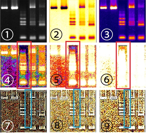 上記のSTAP細胞に関する電気泳動画像の分析では、(4)~(9)の結果により、他の実験結果の写真を長方形に切り取り、赤枠内にその写真を貼りつけた様子がうかがえます。
