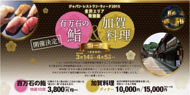 2015年3月14日に北陸新幹線が開通することで、注目度が非常に高い石川県金沢市において、多くの人たちが金沢の食だけでなく金沢の伝統文化の魅力を理解し、足を運ぶきっかけとなるよう、金沢エリアだけの特別版『百万石の鮨&加賀料理ウィーク』を3月14日(土)から4月5日(日)まで開催します。
