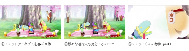 舞台は地球の某お花見会場。フェットくん、チーネくん、グミ星人の3体が重箱に詰めた「フェットチーネグミ」を囲み、ゆる〜いトークをしています。そのトーク内容は、日本でいう“お花見”に該当する眺める習慣について、グミ星人が住む星における謎の物体“ポコ”の話題で盛り上がります。果たして謎の物体「ポコ」とは!?話を進めるグミ星人に対して、フェットくんが連想する「ポコ」が一致しないまま展開していく噛みあわない様で噛みあっている会話が沸々と笑いを誘います。そんな「ポコ」の正体はエンディングで明らかになります。3体のゆる〜い会話と不思議な世界観(+3体の後ろで織り成される人間模様?)をお楽しみください。