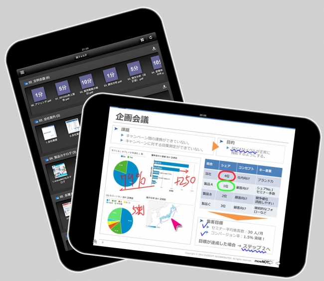 moreNOTEは、ドキュメントや動画、画像などをサーバー(クラウド/オンプレミス)で一元管理し、タブレット/スマートフォン/Windows 7 PCから簡単に共有・閲覧・編集できるサービスです。ポインターやペンツール、マルチペアリング機能を備えているため、ペーパーレス会議やプレゼンテーションなど、様々なシーンでタブレットやスマートフォン、既存のWindows 7 PCをスマートに活用することができます。端末の紛失や盗難に備えたファイルの暗号化機能や端末認証機能など、セキュリティも確保。moreNOTEはあらゆるシーンにおいて、新しいモバイルワークスタイルを実現します。