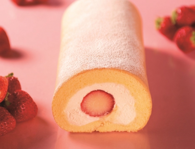堂島ロールにカスタードクリームを絞り、国産いちごを丸ごと並べて、卵風味の生地で優しく一巻きした季節限定の堂島ロール。