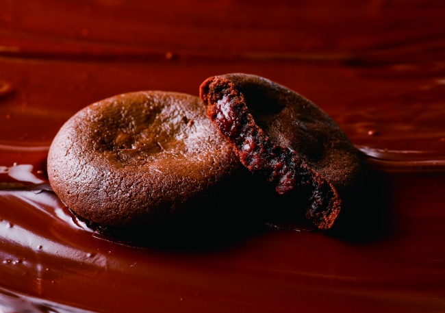 生クリームをたっぷり使用したガナッシュ、それを包む白あんとチョコレートを練りこんだフィリング。しっとりとなめらかなダークチョコのビスキュイで包み3層に焼き上げました。
