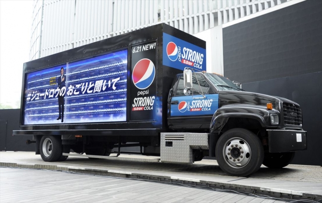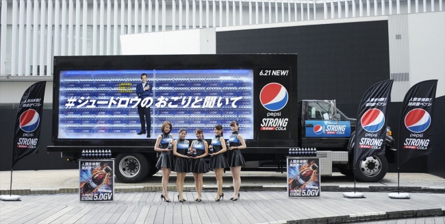 新商品「ペプシストロング5.0GV」を体験していただくことを目的としたプロモーションです。CM出演を通じて「ペプシストロング5.0GV」の大ファンになってくださった ”ジュード・ロウさんのおごり”による、“合計20万本”配布の体験型プロモーションを、「ジュード・ロウ スペシャルトラック」を使って、6月16日から、東京、広島、大阪、仙台、札幌、名古屋、福岡の全国7都市にて実施します。