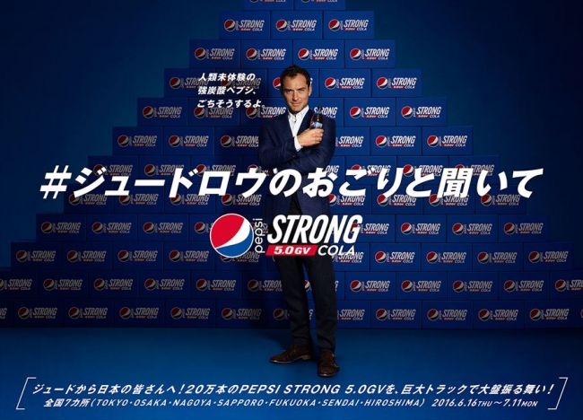 また同時に、「ペプシストロング5.0GV」を20万本配布する「#ジュードロウのおごりと聞いて」プロモーションを全国7都市にて、6月16日(木)から7月11日(月)までの期間で実施します。