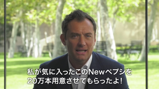 ジュード・ロウさんが緊急来日し、大勢の記者に囲まれる中、来日目的を問われ、「欲しいモノが日本でしか手に入らないからさ」と答えます。「それは何ですか?」とさらに追求する記者に対し、歩くのを止め、「人類が体験したことのないものだよ」と記者を見渡しながら意味深に語ります。日本だけで発売された 「ペプシストロング5.0GV」を飲みに来日したという、まさかの展開とともに、新商品を飲むシーンでは、“人類未体験の強炭酸ペプシ”の革新的な味わいを体験し、その刺激的なおいしさを表現しています。