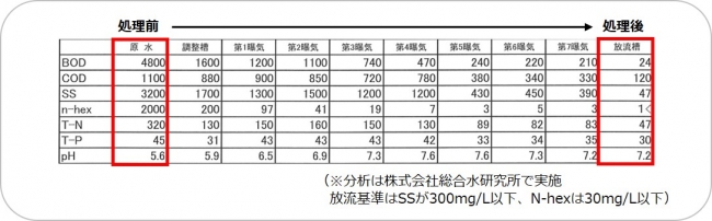 また、同年行われた水質分析でも、処理後(放流槽)の数値は放水基準を満たすレベルまで減少していることが分かりました。これらの調査結果を受け、効率的かつ確実な水処理が行えたのは「アクアブラスター」の導入により微生物の活動が活発になったためと考えられます。