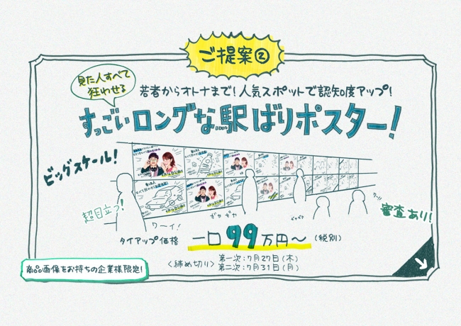 99万円から購入可能な「すっごいロングな駅貼りポスター」を始めとする超お買い得!早い者勝ち!!珠玉のタイアッププランをご用意!!!