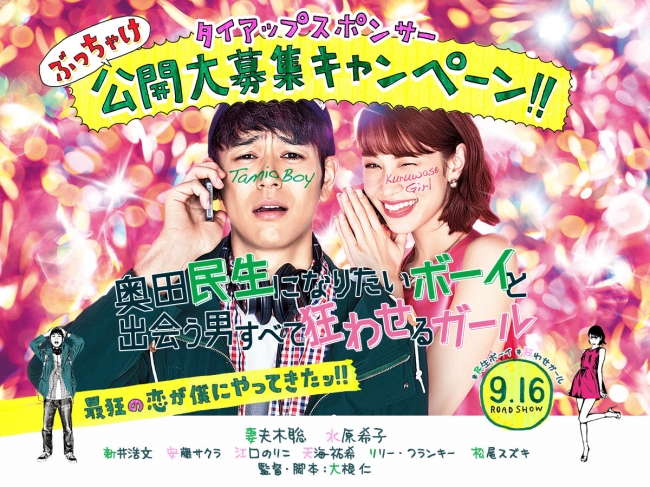 「民生ボーイと狂わせガール」製作委員会は、2017年9月16日(土)の映画公開に向けて、本日7月25日(火)より、映画のタイアップスポンサー様を公開大募集する『タイアップスポンサー ぶっちゃけ公開大募集キャンペーン』をスタートします。〈 特設サイトはこちら | http://tamioboy-tieup.jp 〉