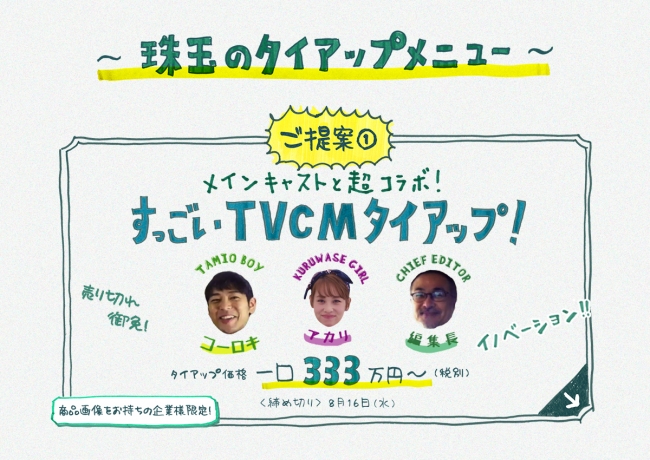 コーロキ(妻夫木聡)・あかり(水原希子)・編集長(松尾スズキ)が活躍するシーンを使って貴社商品の魅力をぐいぐい引き上げるTVCMを制作します。
