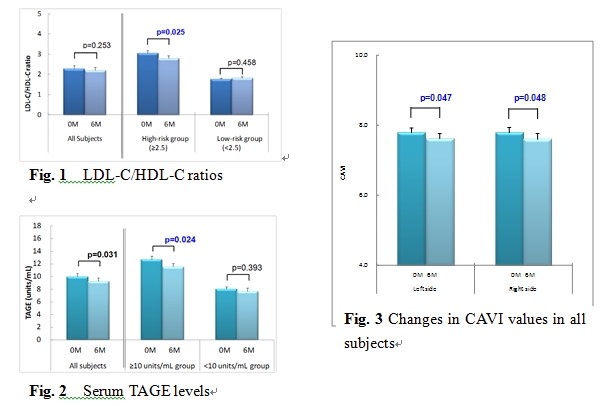 ヒト健常人ボランティア30名にコラーゲン・トリペプチド(CTP)を6ヵ月間飲んでもらい、動脈硬化指標であるlow-density lipoprotein cholesterol(LDL-C)とhigh-density lipoprotein cholesterol (HDL-C)の比(LDL-C/HDL-C比)、Toxic advanced glycation end-priducts (TAGE)値、cardio-ankle vascular index(CAVI)値および関係する検査項目について、摂取前後の変化について評価した。その結果、LDL-C/HDL-C比は初期値が2.5以上であった高値群において有意に低下し、CTPが血中脂質のバランスを改善することが示された(Fig. 1)。TAGEは全被験者の実施前後において有意な改善を示し、血中の終末糖化産物の発生が抑制されることが示された。特に、初期値が10 units/mL以上のハイリスク群で改善効果を示した(Fig. 2)。CAVI値は有意に低下し、CTPを摂取することで血管の弾力性が回復することが示された(Fig. 3)。CAVI は、加齢に伴い10 歳で0.5ポイント増加することが知られており、CTP 6ヵ月間の摂取で0.2ポイント低下したことは、その予防・改善効果の高さを期待させる。以上の結果から、「CTPの摂取が動脈硬化の改善効果を示す。」ことが示唆された。