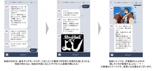 相談相手になるのは、大の甘党である銀さんこと坂田銀時、侍魂を学ぼうと銀時の下で働く志村新八、本作のヒロインであり、宇宙で最強と言われている夜兎族の少女・神楽の3人。お腹が空いていつもの様子と違うキャラクターに、購入したスニッカーズ®のパッケージ写真を送ると相談がスタートします。相談内容はキャラクターによって異なり、坂田銀時は「恋愛」 「進路・将来」 「仕事」について、志村新八は 「コンプレックス」 「アイドル」について、神楽は「友達」について、さらに「定春」も相談に乗ります。原作同様のギャグモードの回答や、時折、的を射た本質的なアドバイスを返してくるため、飽きることなく楽しめます。それぞれの相談内容を判断した会話はもちろん、送られてくる画像を認識し、それに応じたリアクションをするなど、AIならではの機能も備わっています。キャラクターの特徴を踏襲したやり取りは、LINE上で会話をしているかのような気分を味わうことができます。
