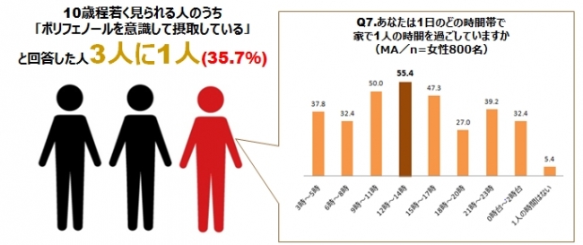 ✔ 実年齢より10歳程若く見られる女性の、3人に1人はポリフェノールを意識して摂取していた!特に昼食時にほっと一息つける贅沢な“おひとリッチ時間”がある女性は、若く見られることが判明!