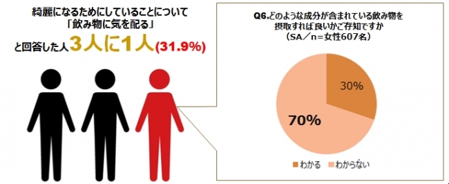 ✔ 美容に関心がある女性の3人に1人が、飲み物でも美容を意識している一方、