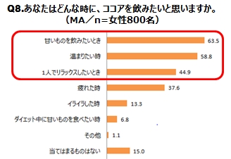 ✔ ポリフェノールを含むことで有名なココア、飲みたい理由は1位甘いものを飲みたいとき、2位温まりたいとき、3位は一人でリラックスしたいときだった!