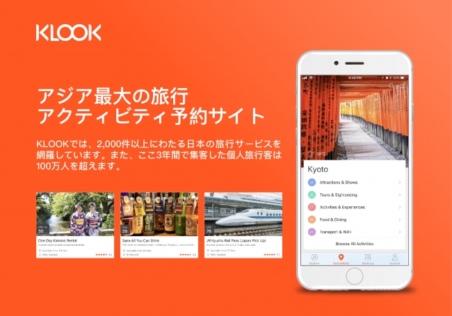 2014年に香港に設立されたKlookは、旅行者が、人気のあるアトラクションや体験アクティビティが会員価格で簡単に予約できるサービスを提供する。世界中のどこにいても、Klookのスマートフォンアプリやウェブサイトにアクセスし、アクティビティをみつけて予約、即座にeチケットを受け取り、簡単に旅行を楽しむことが出来る。