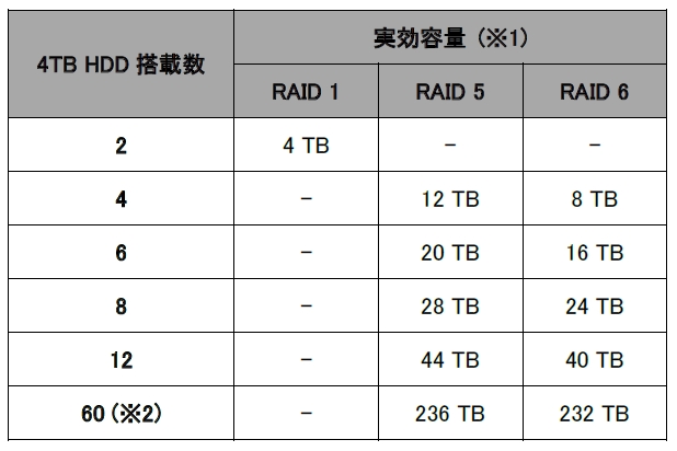 ※2 HDD 60台モデルの場合、実際は複数のボリュームに分割して使用するのが現実的なため、実際の実効容量は