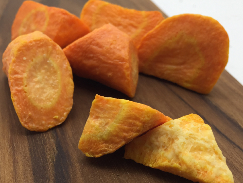 国産の良質なニンジンの皮を剥いた後に、乱切り→ボイル→フリーズドライ加工し、りんご蜂蜜風味チョコレートをFCOM®製法で含浸しています。