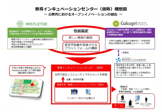 Mistletoeは、東京学芸大学キャンパス内に「教育インキュベーションセンター(仮称)」の拠点となる施設を建設し、東京学芸大学と合同で設立する組織が軸となり同センターを運営していきます。