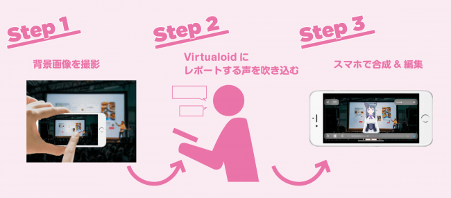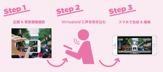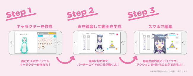 - 誰でもカンタンに、スマホひとつを使って、たったの3Stepでバーチャルキャラクター動画を作成できます。