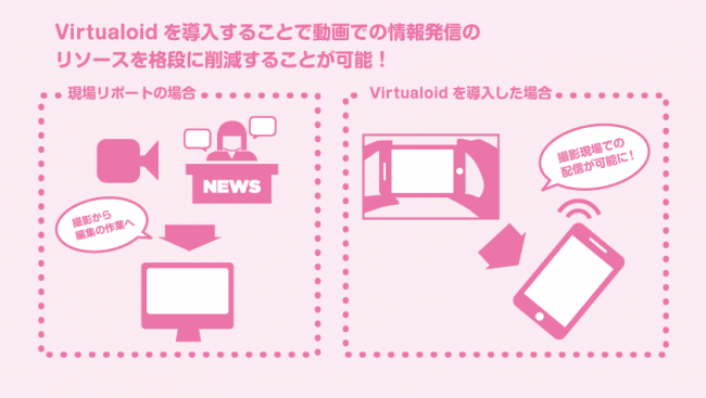 バーチャルYouTuberをはじめとしたバーチャルキャラクターの需要が高まった現在、企業や地方自治体、ニュースメディアの情報発信を、人間ではなくバーチャルキャラクターが行うことで、人的、そして設備リソースの大幅な削減を目指して本アプリを開発しました。出演者、カメラマンをアサインし撮影を行い、編集スタジオで編集した動画を配信する従来の方法とは違って、発信すべき情報を撮影、音声による説明を付加し、すぐその場で編集、配信ができるVirtualoidはSNS時代の情報発信を格段にスピーディーかつ効率的にします。■「Virtualoid」の使い方・利用シーン