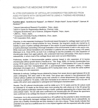 そこで、社会福祉法人仁生社江戸川病院(東京都江戸川区 院長 加藤正二郎)、日印再生医療センター(インド・チェンナイ 代表 Samuel JK. Abraham)、蓮見国際研究財団(東京都杉並区 理事長 蓮見賢一)はこれを課題として科学者や臨床医によるチームを組み、高齢患者の関節軟骨から再生可能な軟骨細胞の培養を行うポリマーバイオマテリアルベースの新しい技術研究に着手し、推進していました。この研究は、高齢患者の膝関節置換手術において破棄された関節軟骨から採取した軟骨細胞を利用し、患者の細胞形体を維持しながら、インビトロ(人工)環境下で再生可能な軟骨組織として成長させるためのもので、同チームは2019年4月にカナダのトロント大学で開催された年次再生医療シンポジウム(TPRM2019)においてその研究成果を発表しました。注目すべき点は、患者の年齢が、65〜85歳の高齢者であること、また、患者生来の硝子軟骨の形態を維持しながら細胞の成長を助けるポ
