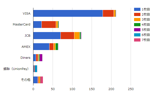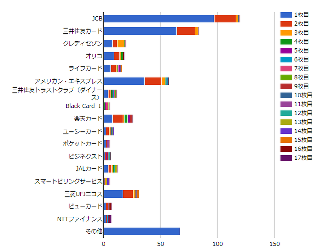 多い順に「JCB」「三井住友カード」「アメリカン・エキスプレス」「三菱UFJニコス」「楽天カード」