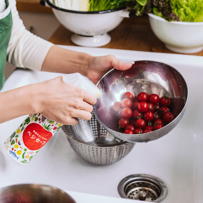 ベジセーフは、店頭に並ぶ野菜や果物の品質を保つために使われる防腐剤や、残留農薬の除去に、このアルカリ電解水を応用できないかと考え開発いたしました。クリーニング事業で汚れを落とすこと、人の健康にこだわってきたからこそ生まれたのが、このベジセーフです。