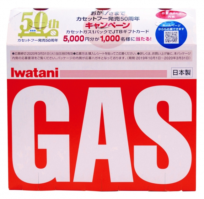 「カセットフー発売50周キャンペーン」(10/1~3/31締切)では、イワタニカセットガス3本組1パックをご購入いただいた方に、50周年にちなみ“5,000円分のJTBギフトカード”を抽選で1,000名様にプレゼントいたします。例年のキャンペーンを拡大し、当選者数を500名から2倍の1,000名に、応募条件をイワタニカセットガス3本組2パックから1パックに変更し、より多くの方に参加いただけるキャンペーンにいたしました。