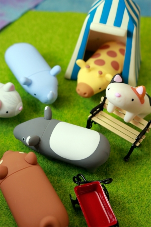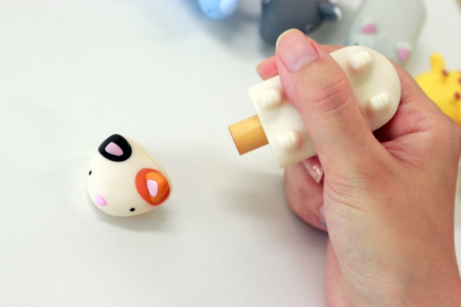 ゆるくてかわいい動物をモチーフにしたパペット(人形)のようなハンコケース。しばいぬ、みけねこ、きりん、さい、まれーばく、たなかさんちのねこの6種類。キャップを外せばそのまま”ペタッ”となつ印できます。