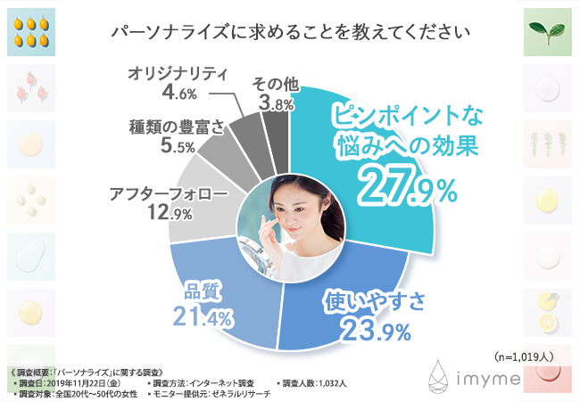 最後に、「パーソナライズに求めることを教えてください」という質問をしたところ、「ピンポイントな悩みへの効果」(27.9%)という回答が最も多く、次いで「使いやすさ」(23.9%)、「品質」(21.4%)、「アフターフォロー」(12.9%)、「種類の豊富さ」(5.5%)、「オリジナリティ」(4.6%)と続きます。