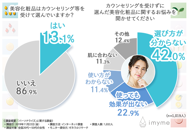 そこで、「美容化粧品はカウンセリング等を受けて選んでいますか?」という質問をしたところ、「はい」(13.1%)という回答は1割程度という結果が出ました。