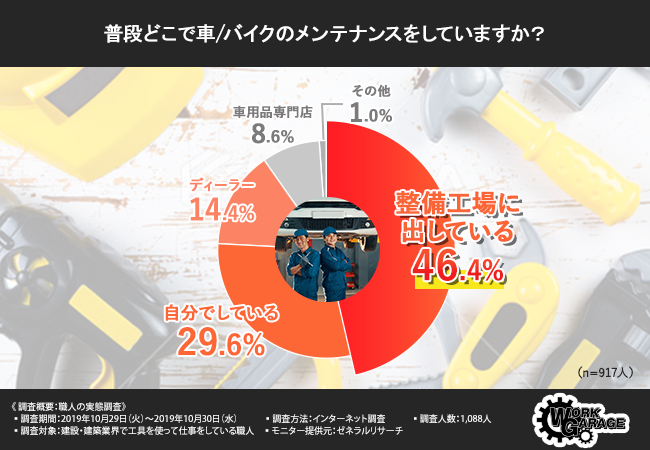 そこで、「普段どこで車/バイクのメンテナンスをしていますか?」と質問したところ、『整備工場に出している』(46.4%)という回答が最も多く、次いで『自分でしている』(29.6%)、『ディーラー』(14.4%)と続きます。