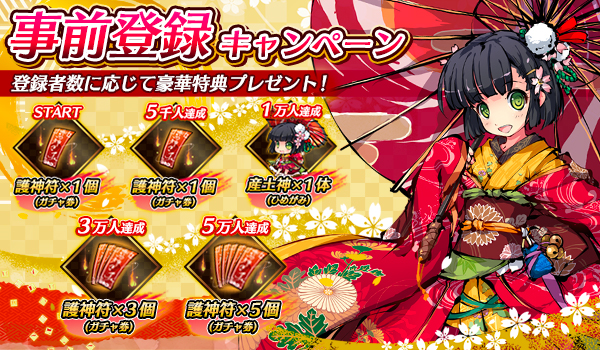 配信開始に先立ち、事前登録人数に応じて、護神符(ガチャ券)や可愛い「ひめがみ」が手に入る事前登録キャンペーンも実施しています。