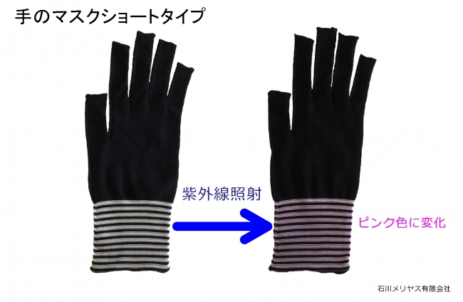 ニット小物製造工場の石川メリヤス有限会社(所在地:愛知県西尾市)は、指先から手首までをしっかりと覆い、紫外線が当たるとピンク色に変化する薄型日よけ手袋「手のマスク®ショートタイプ」を、新たに販売します。
