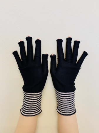 ・手首から指先まで隠せる丈です。ドアノブなどに直接触れることを避けられます。指はすっぽり隠せる長さですが、先端部分は穴が開いているため、デザインネイルなど長い爪の指でも楽に装着できます。