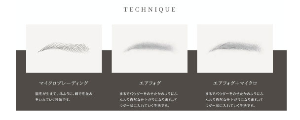 これは先述の三宅氏が考案したもので、霧のような柔らかい眉を再現するテクニックです。優しく上品な仕上がりへの調整を行い、入れたままの状態が数年単位持続するように図ります。他のテクニックと組み合わせてより立体的な眉に導くことも可能です。