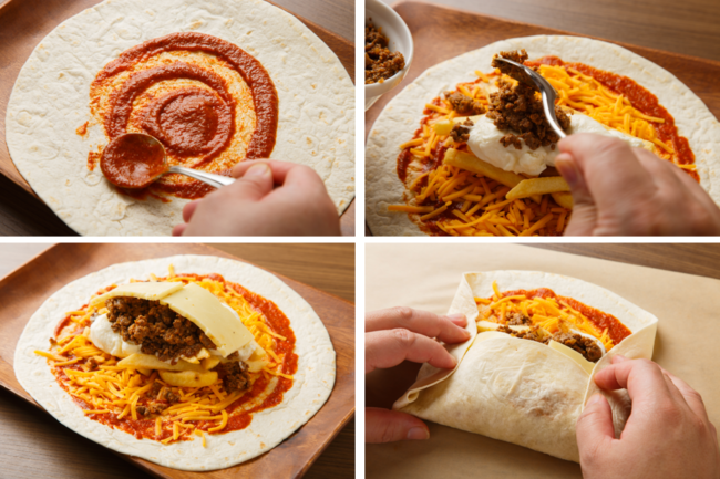 それぞれフィリングは肉、ソース、ポムフリット、チーズ。そして、パニーニグリラーを使用し、挟み焼きでグリルするのがフレンチタコスの特徴です。