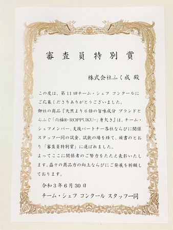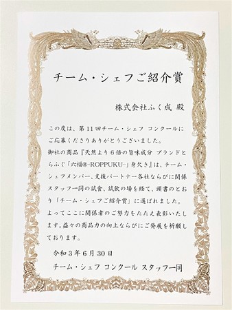 株式会社 ふく成(本社:熊本県熊本市西区、代表取締役:平尾 優)は、「第11回 チーム・シェフコンクール」においてブランドとらふぐ「六福®-ROPPUKU-」が最優秀賞となる「審査員特別賞」他3つの賞を受賞しました。