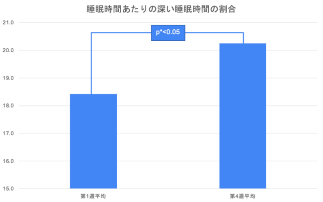 Fitbitから取得した深い睡眠状態の時間と睡眠時間とを用いて、睡眠時間あたりの深い睡眠時間の割合を算出した。その結果、第1週と比較して第4週において、深い睡眠時間の割合が有意に上昇した。一般的に、深い睡眠は睡眠の質に影響しているとされており、睡眠の質が向上したと考えることができる。
