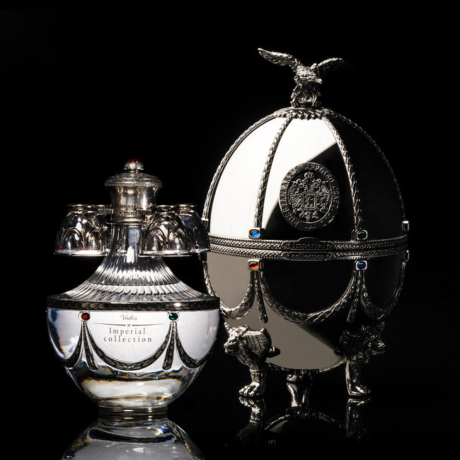 ロシア皇帝にはじまり、今もなお愛され続けるファベルジェの最高傑作へのオマージュを込めて、「Imperial Collection Vodka」と名付けたこのシリーズ。絢爛豪華な装飾を纏ったエッグの中には、優美なヴェネツィアングラスに装飾を施した、デキャンタと4つのショットグラスが収められています。そのデキャンタに詰められているのは、国家規格で認められた最上級ランクの原材料にこだわり、ロシア伝統の製法で精緻に造られた、スーパープレミアムウォッカ。2006年に開催された「ロシアサミット」では各国首脳に振る舞われるなど、ロシア屈指のクオリティーを誇る逸品です。