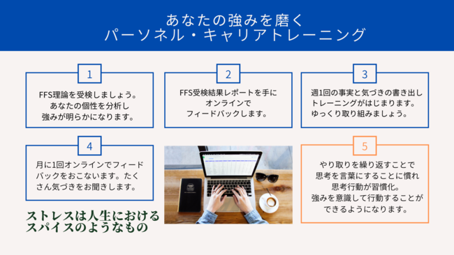 いままでFFS理論を活用したい場合は、法人として導入するしかありませんでした。今回、FFS理論が「パーソネル・キャリアトレーニング」に用いられますが、個人向けキャリア支援サービスにFFS理論が活用されるのは日本初の試みです。