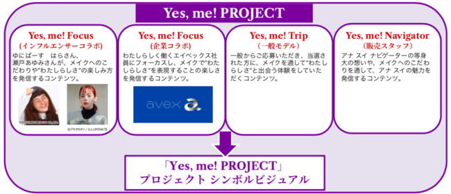本プロジェクトでは、SNS世代に人気のお笑い芸人 ゆにばーす はらさん、ファッション業界で活躍している 瀬戸あゆみさんをはじめ、音楽・映像事業や様々なエンタメコンテンツを創造し続けているエイベックス株式会社とコラボレーションを行う「Yes, me! Focus(インフルエンサーコラボ・企業コラボ)」、一般募集のモデルやアナ スイのナビゲーター(販売スタッフ)が参加する「Yes, me! Trip」「Yes, me! Navigator」の4つのコンテンツを展開。また、8月1日(日)発売の新作ルージュが手に入る「Yes, my rouge! Campaign」も実施します。