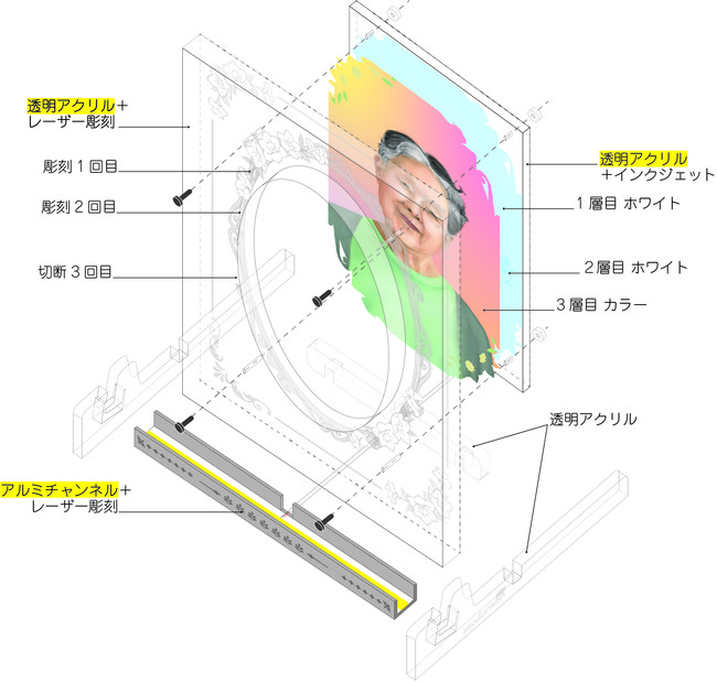 深さの異なる2段階のレーザー彫刻、高さの異なる2段階のホワイトプリント。フレームと遺影背景に立体的表現をしております。