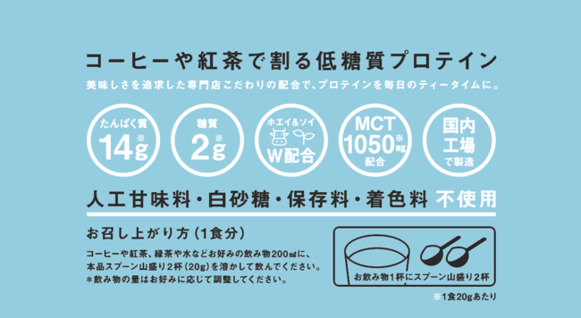プロテインシェイク専門店をオープンして以来「牛乳や豆乳で割らずに美味しいプロテインが飲みたい」という声から開発された新ジャンルのプロテインです。糖質やカロリーを控えながらもタンパク質はしっかりと摂りたいという方向けに、コーヒーや紅茶で割ることに着目。美味しさを損なうことなく低糖質な新しいジャンルのプロテインが完成しました。