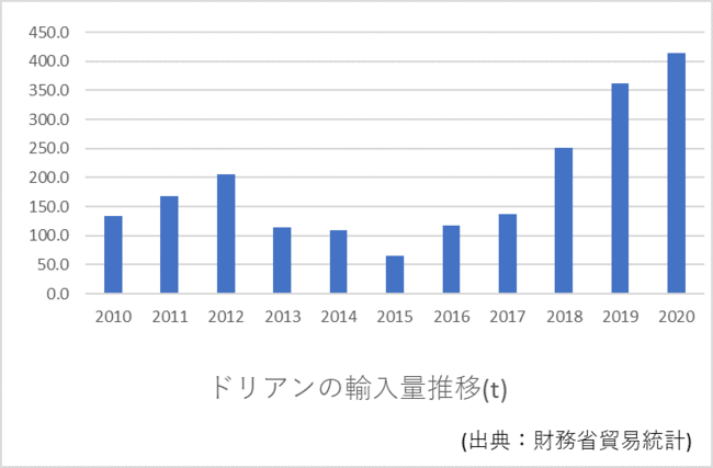 近年、日本のドリアンの輸入量は、財務省貿易統計では2015年には約65.1トンでしたが、2020年には約413.8トンと、5年間で大きな増加を示しています。また、中国では2020年の輸入額が23億ドル以上にものぼり、前年に比べて約35%増加しています。※1