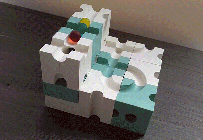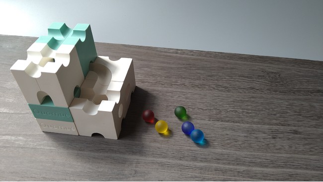 Quomuéで築ける小さな建築物の種類は無限大。4センチ角の小さなブロックは、卓上でも手軽に遊べて片付けも簡単です。ただし、軽いビー玉はわずかな段差でも転がらずに止まってしまうため、丁寧な作業が必須。それだけにビー玉が思い通りに走り抜けたときに得られる達成感は大きなものです。楽しく遊びながら、想像力や思考力などの“非認知能力”といわれる能力の発達を促し、次世代を担う人材の育成に貢献します。