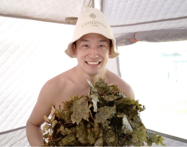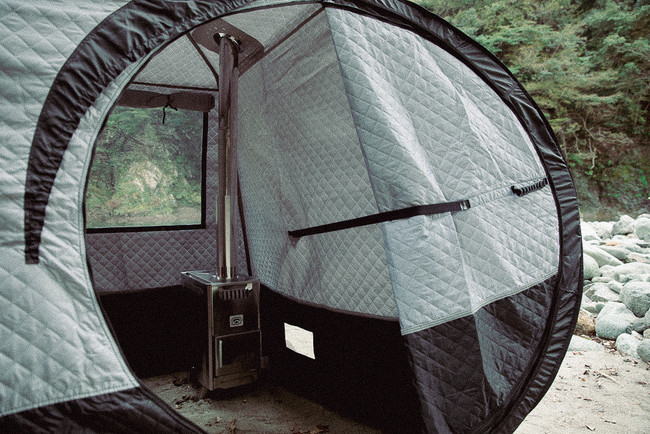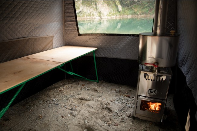 特別に開発された3層の断熱生地によってテント内は、薪の燃え具合によっては120℃を超える熱さ。寒さが厳しいシベリアの冬で、−40℃の外気温でもアツアツの蒸気浴を楽しめる。